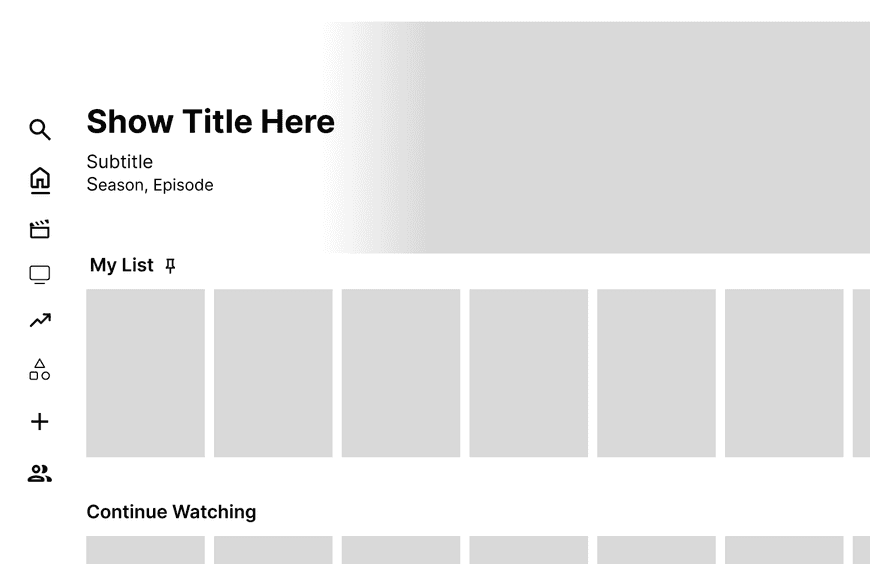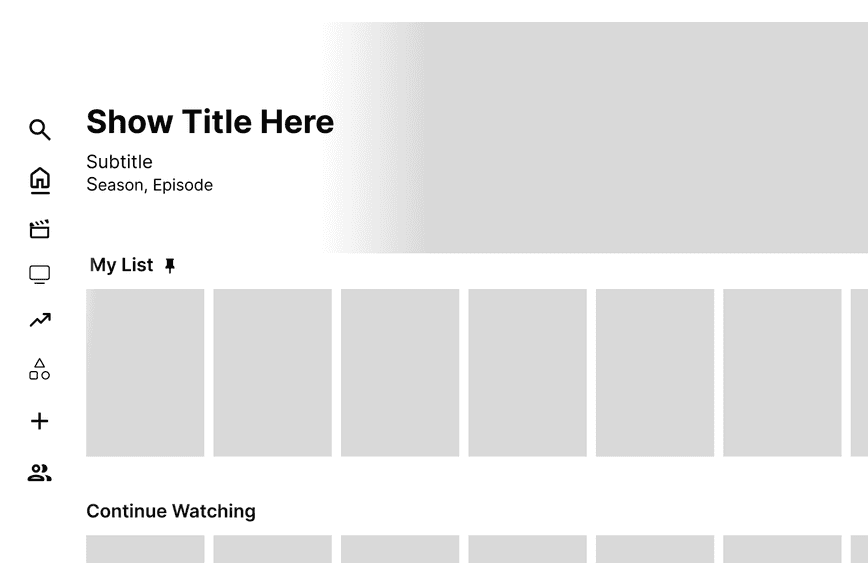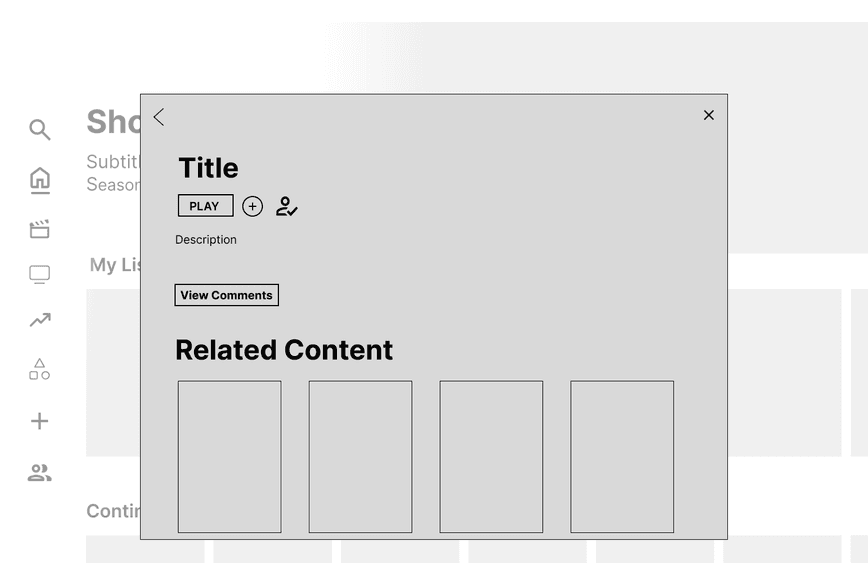 From our user flows and journey maps, we started working on the base of our design. Our goal was to keep the original layout of Netflix with blended enhancements and functions that were seamless with the original service. To bring our frameworks to life, we began working on low fidelity frames.