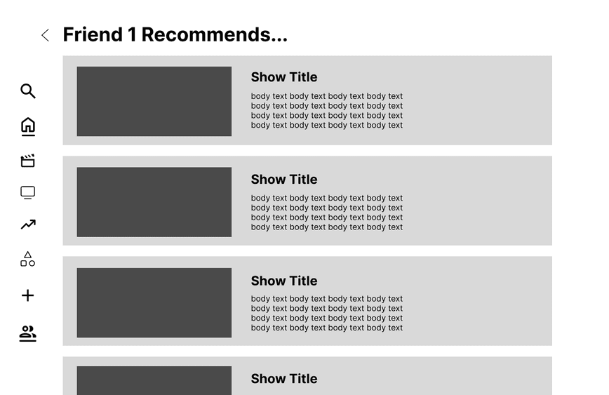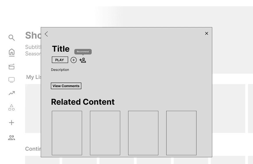 As users hover over the new icon, they will see an option to recommend. Once they recommend the show to a friend, it will be replaced by a check mark. More detail to the feature was added in the hi-fidelity design.